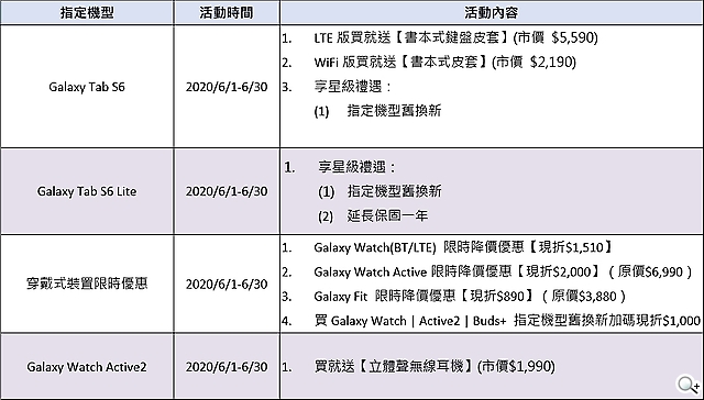 除上述手機產品外,期間購買 SAMSUNG Galaxy Tab S6 平板電腦 LTE 與 Wi-Fi 版本,