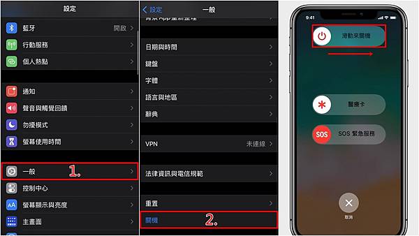 第二個方法比較少人知道,當你的iPhone實體按鍵故障、或是懶得同時按鍵,就可以用這招來關機:首先打開iOS「設定」>「一般」,滑到底部點選「關機」,最後用手指向右滑動畫面,即可成功關機。