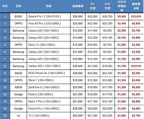 某知名通信指出,五月整體總降幅範圍則在 8%-35%,其中第一名由 Sony 的 Xperia PRO-I 奪下,單月下殺 5,900 元,目前市價距離原始價格已經有 12,010 元的跌幅,另外三星的 Galaxy S21+ 也已經有超過 10,910 元的下殺折扣。