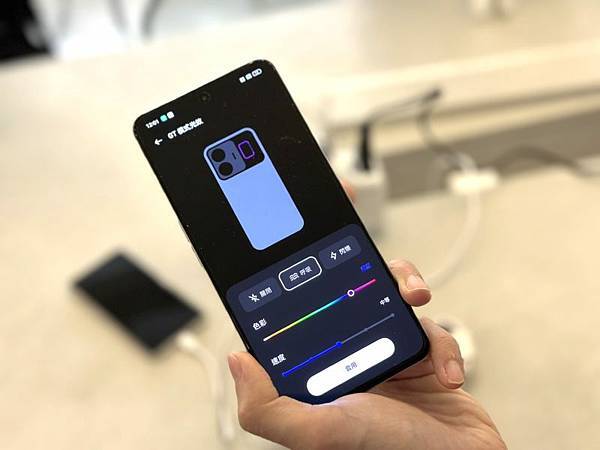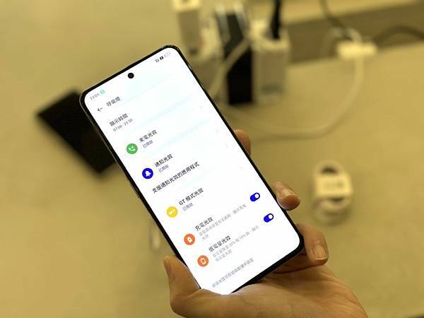 此外,手機也設計了C形的RGB光環LED燈,這個LED燈可自訂25種顏色變化以及5種閃動速度,除了在來電、通知時可亮起以外,也能當作充電 / 低電量的提示、或是拍照時的倒數提示燈。此外在GT遊戲模式開啟時,也能設定讓它亮起,讓手機更有電競感。