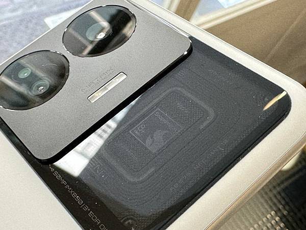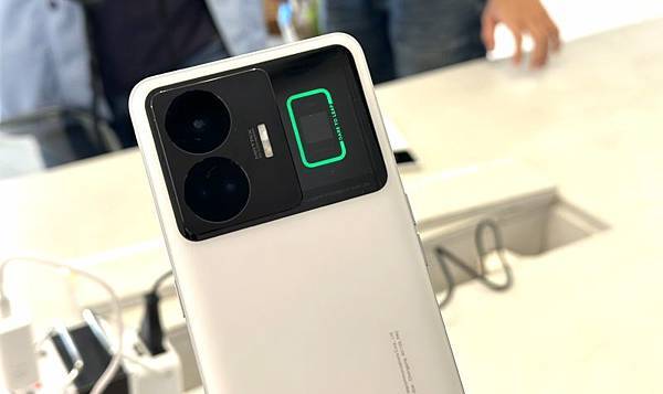 realme GT3推出黑色與白色款式,現場展出的是白色款。它的背蓋採玻璃材質設計,並有白色霧面與黑色透明的區隔,上半部黑色透明區塊除了可以看見NFC天線外,也鑲有一塊Snapdragon 8+ Gen 1的處理器銘板。