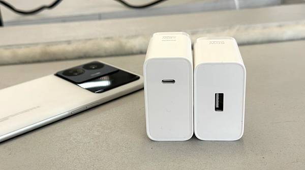 ▲240W(左)與80W(右)的充電器對比,240W充電器體積僅大了一些而已。
